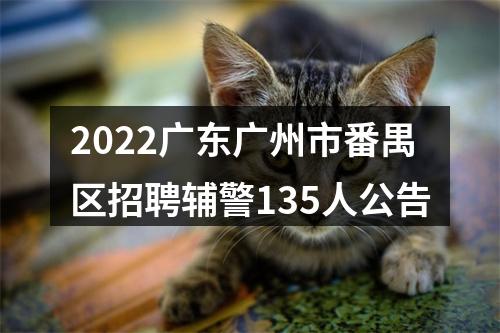 本次招聘辅警135名,由番禺区公安分局统一调配使用(上班地点:广州市番禺区)。主要协助民警开展巡逻防控、治安管理和警务保障工作(具体工作岗位服从用人单位调配)。招聘职位、资格条件等详见《2022年广州市番禺区招聘辅警职位表》(附件1)。
