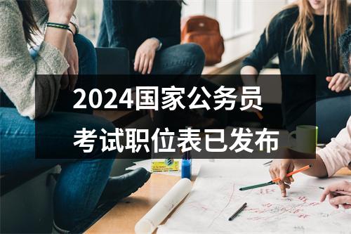 2024国家公务员考试职位表已发布!国考职位包含中央党群机关、中央国家行政机关(本级)、中央国家行政机关省级以下直属机构、中央国家行政机关参照公务员法管理事业单位4大类型,招考单位遍布全国各省(市、区)。中公教育提醒大家,报名开始可以根据个人条件,挑选出所有能够报考的职位,在报名开始后,再根据具体情况选择合适职位报考。以下是20242024国家公务员考试职位表原标题:2024年度招考简章.zip