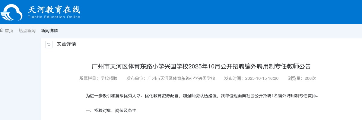 原标题:广州市天河区体育东路小学兴国学校2025年10月公开招聘编外聘用制专任教师公告