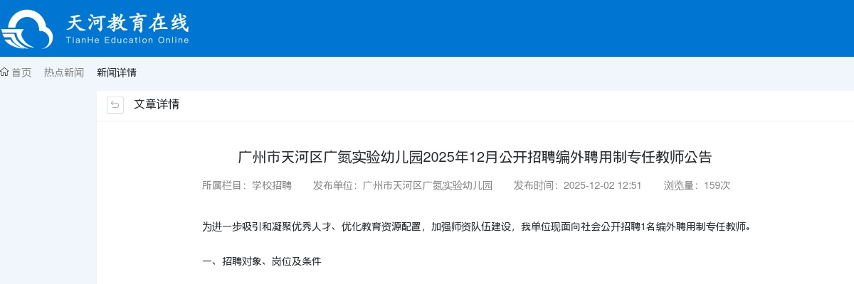 原标题:广州市天河区广氮实验幼儿园2025年12月公开招聘编外聘用制专任教师公告